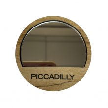 Espelho de bolsa formato meia lua Promocional em madeira ecológico em vários formatos, cortado a laser e personalizado com impressão digital uv direto no material. Medidas: 65 mm diâmetro.
